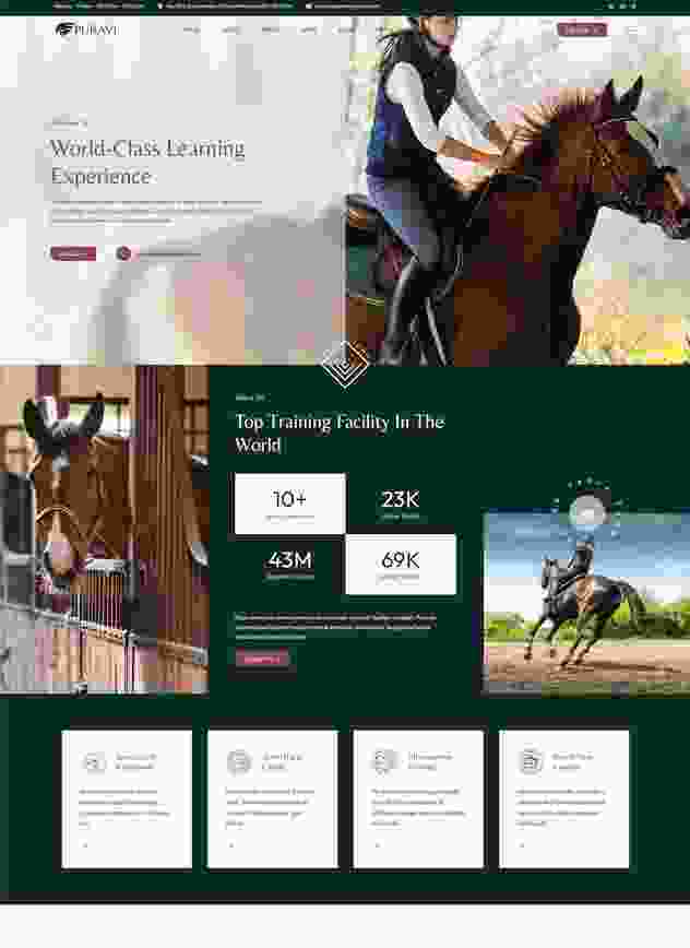 Puravi - is a modern & attractive Theme. It is intended for equestrians’ company, horse riding associations, clubs, schools, courses, horse ranches, shop and riding stables firm. Beautiful design and handy layout are great for indoor & outdoor horse club, including events, staff (trainers, coaches, teaches).