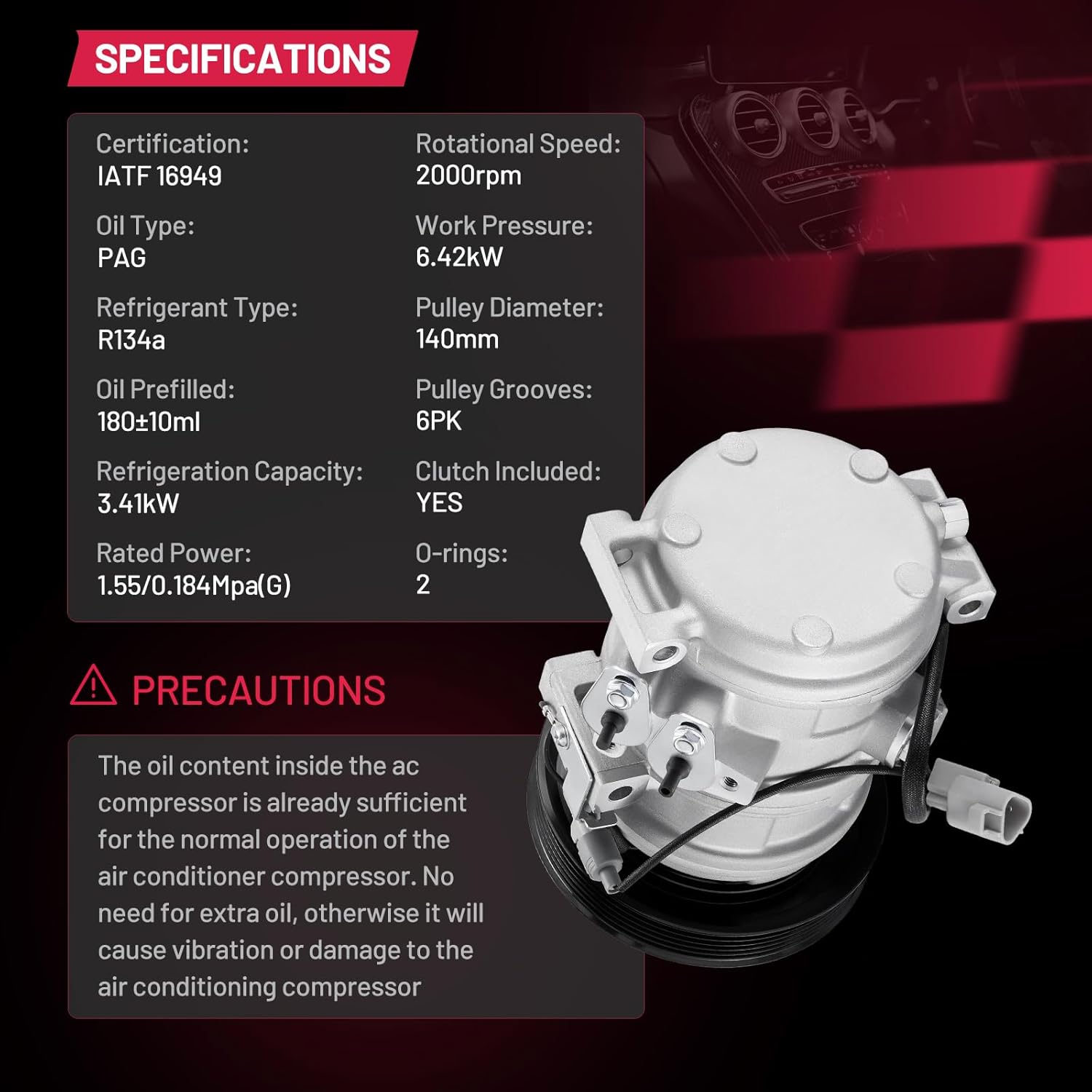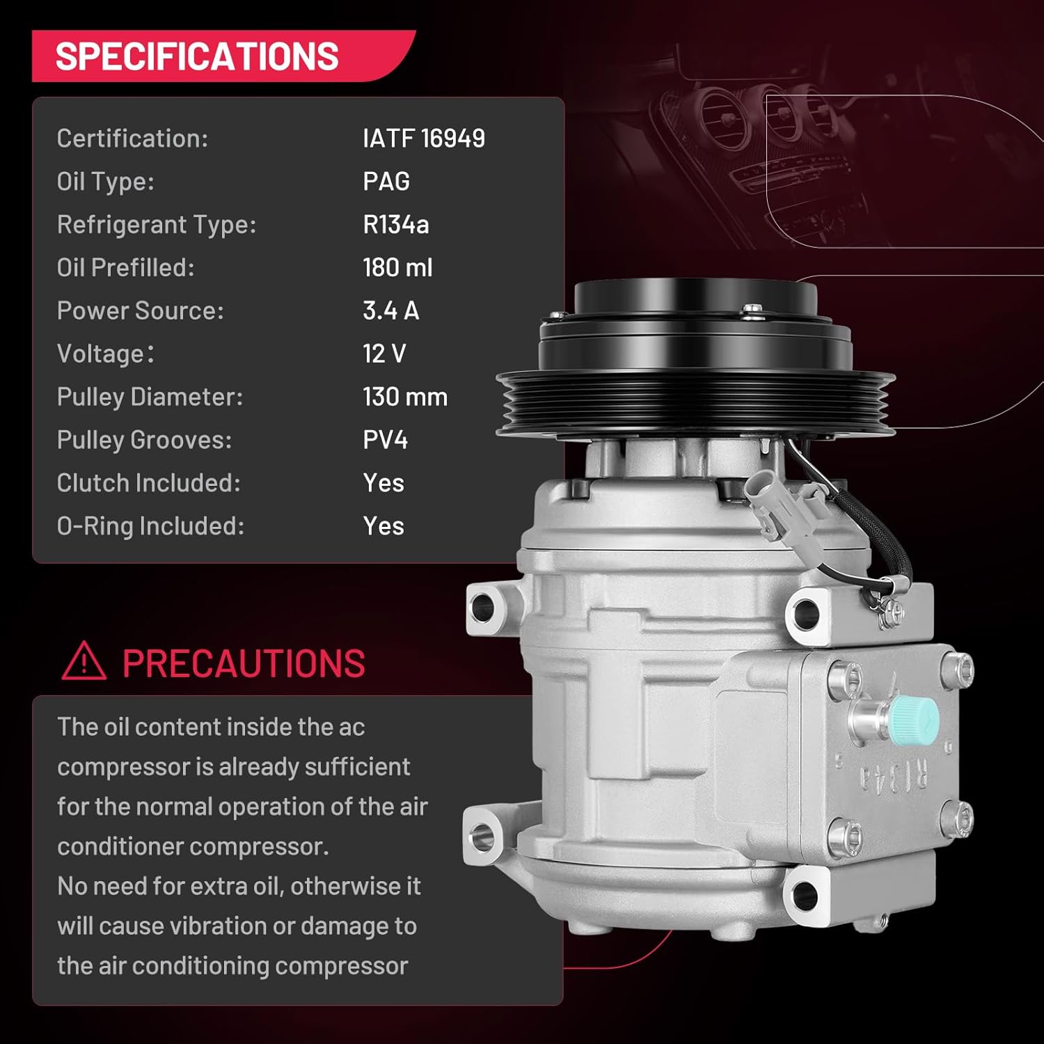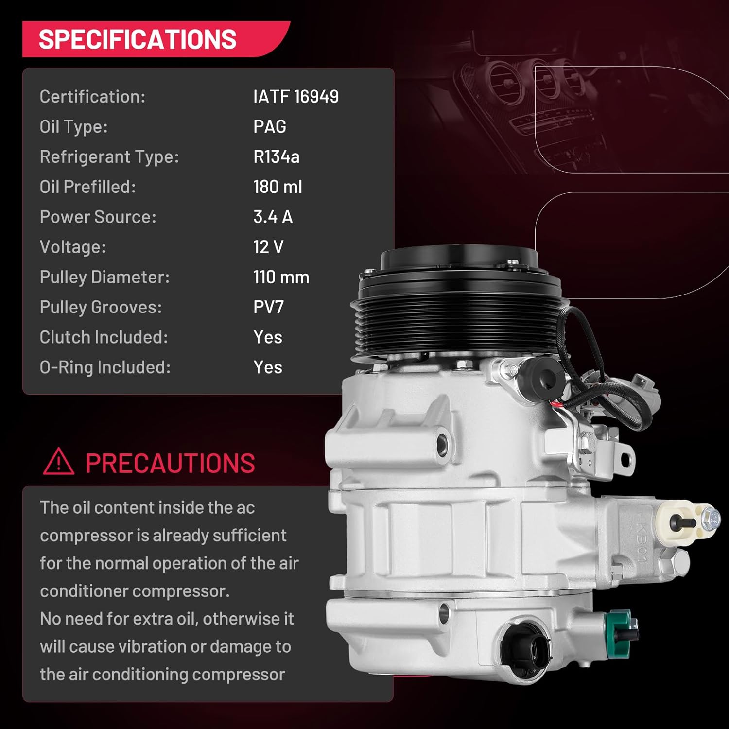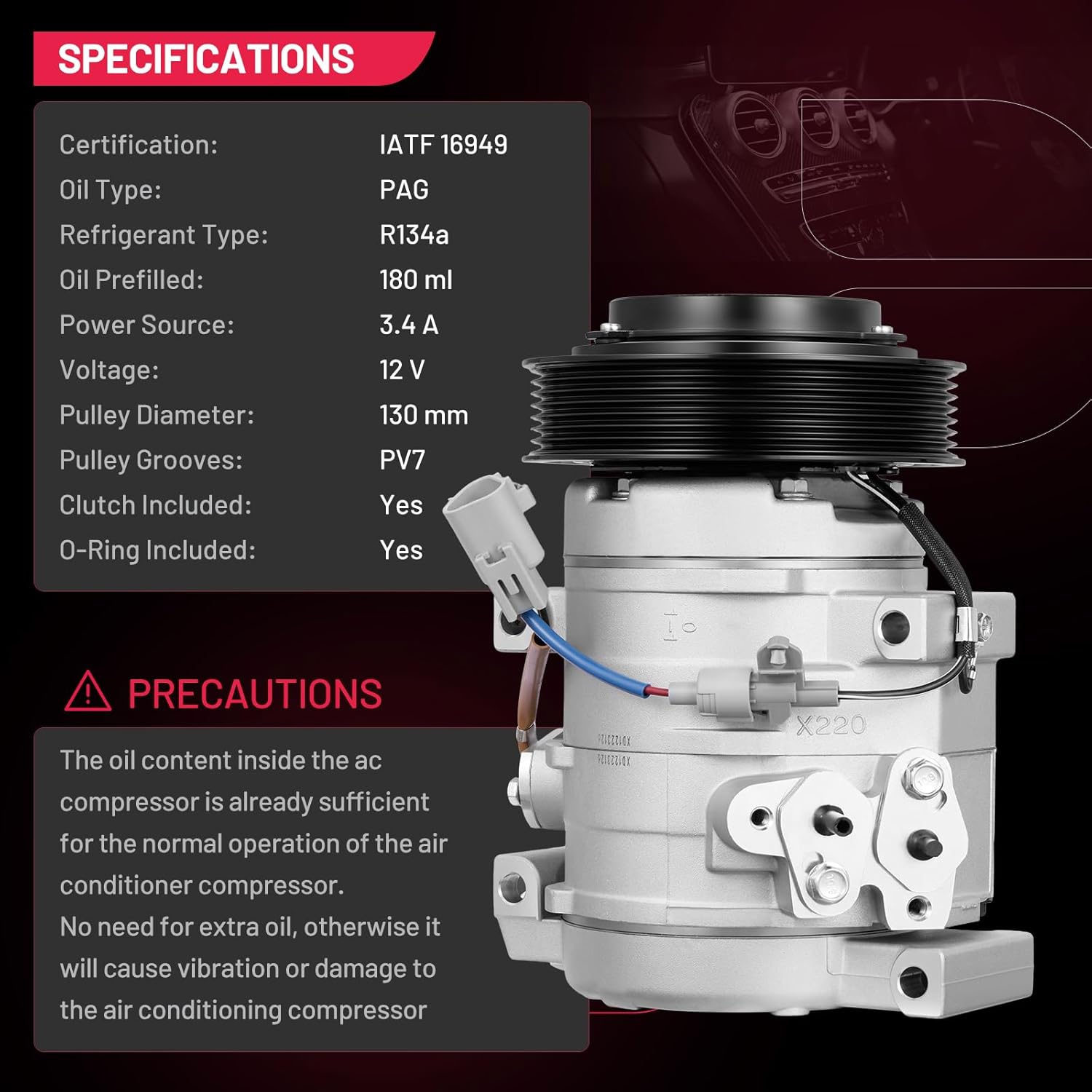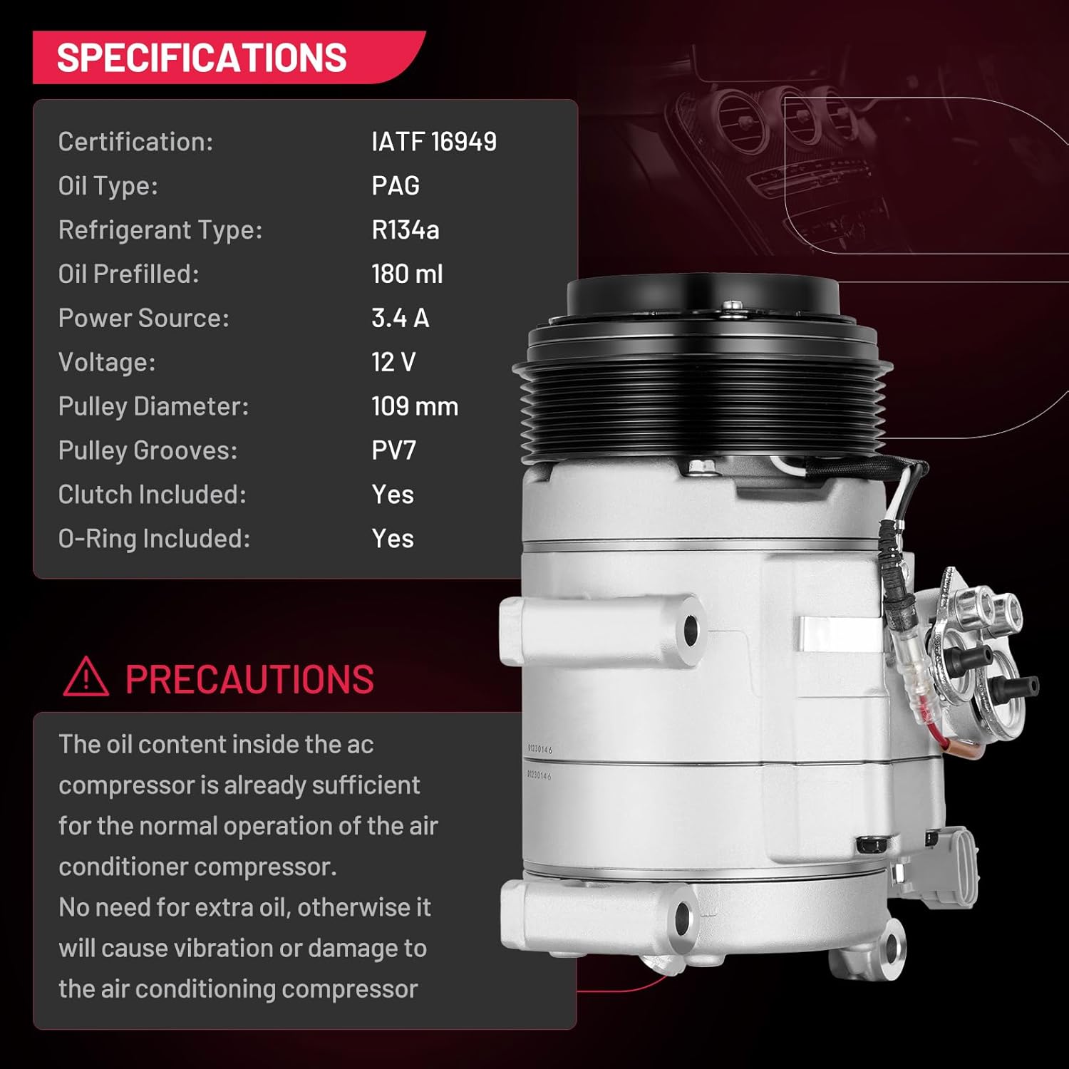 • Installation Notes - The AC compressor is equipped with O-rings, gaskets, and a plug-and-play connector for the R134a system. It comes pre-charged with PAG oil, so no additional oil is required for initial use. Professional installation by a qualified technician is strongly recommended to ensure safety and system integrity